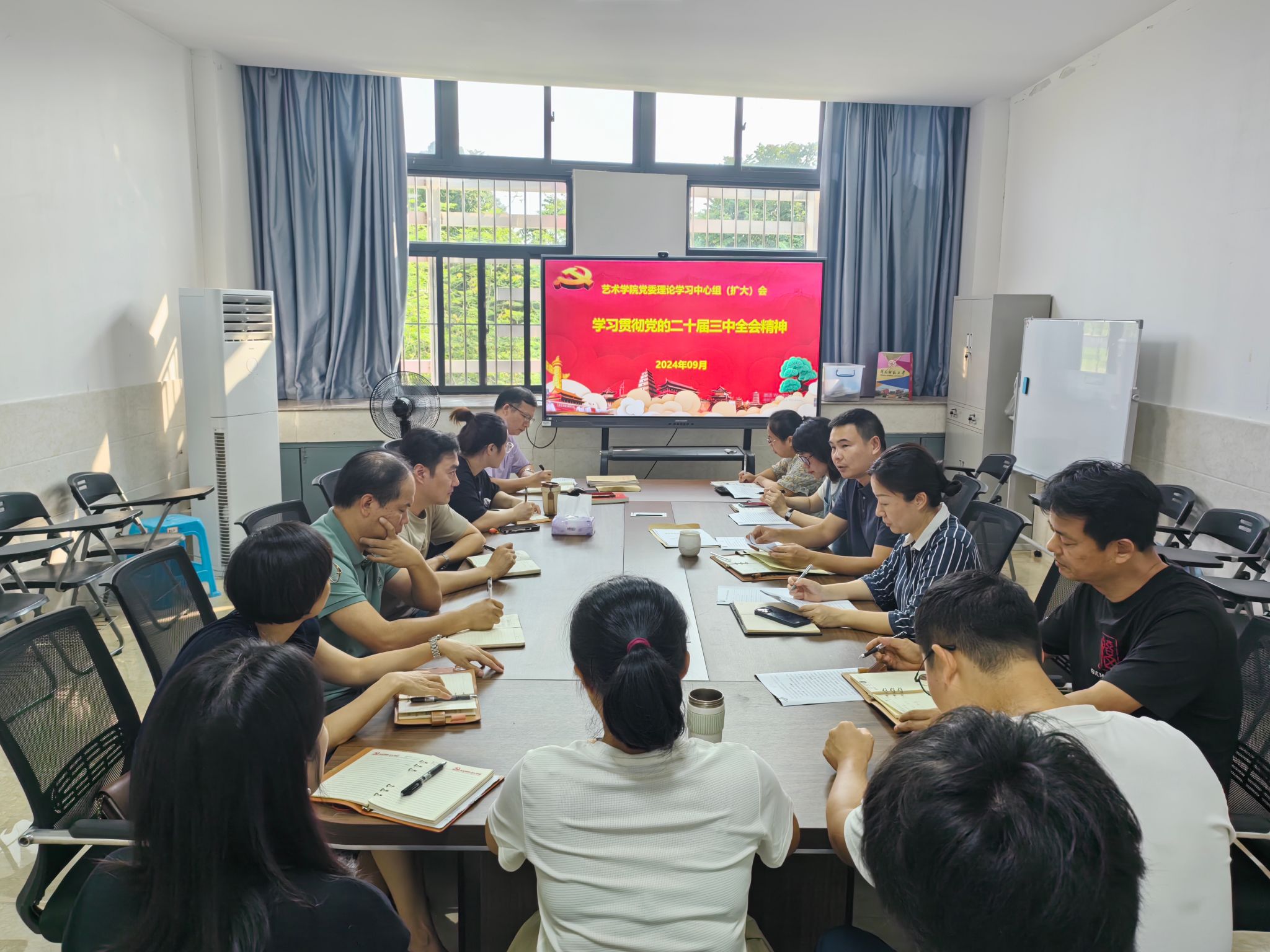 9月12日下午,15vip太阳集团党委召开理论学习中心组(扩大)学习会,传达学习党的二十届三中全会精神、习近平总书记在纪念邓小平同志诞辰120周年座谈会上的重要讲话精神、《中国共产党不合格党员组织处置办法》以及福建省委十一届六次全会精神。学院班子成员、党委委员、各支部书记、各科室负责人参加学习会。学院党委书记潘艺阳主持学习会并部署贯彻落实工作。
