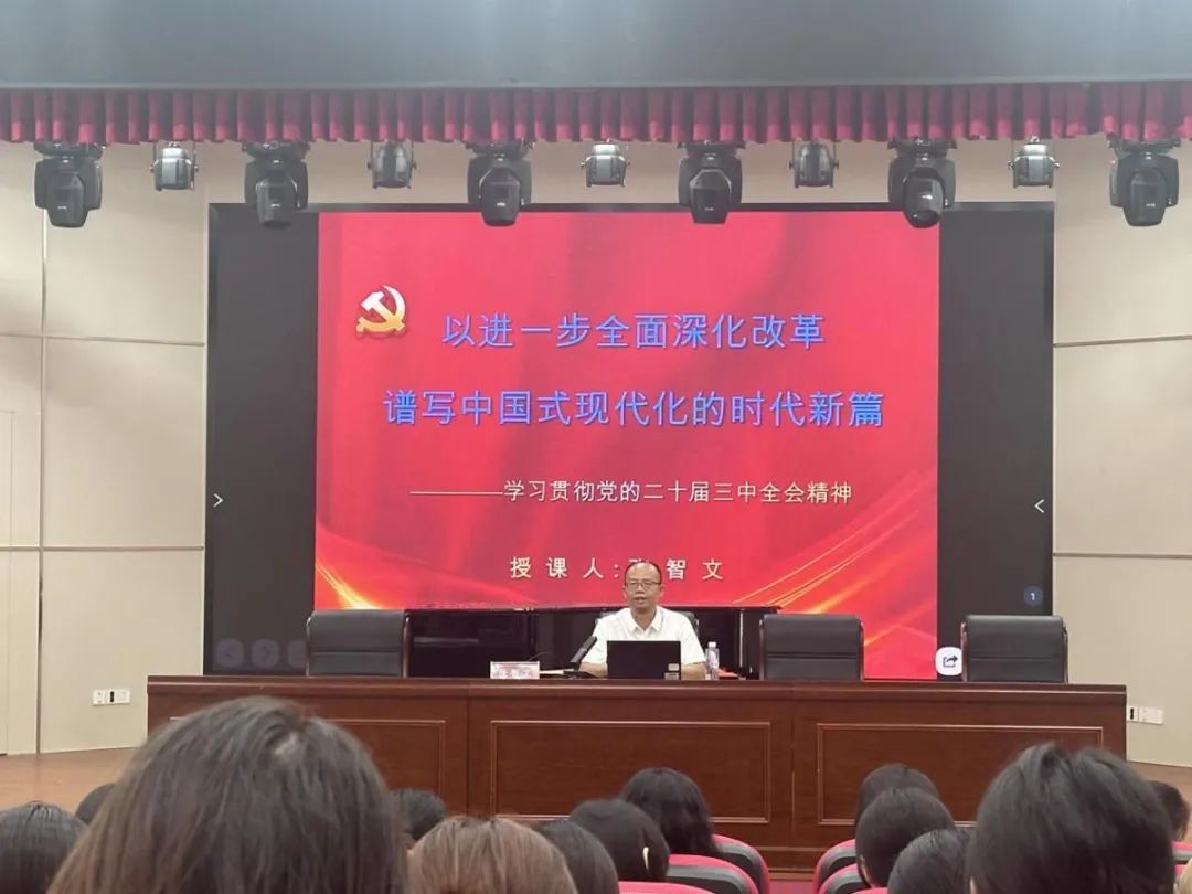 漳州市委宣讲团成员、漳州市委党校统战理论教研室主任张智文副教授围绕“增强学习动力,全面了解全会基本情况;提高政治站位,深刻认识全会的重大意义把握精髓要义,深入学习领会习近平总书记在全会上的重要讲话精神;聚焦关键重点,准确理解《决定》提出的进一步全面深化改革的重大举措;突出实干实效,全力以赴贯彻落实全会精神”等五个方面,结合当前工作学习的情况,对全会精神进行系统讲解和深入阐释。