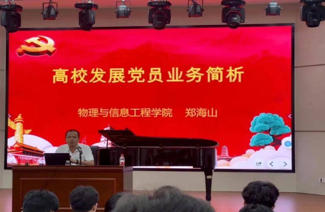 物理与信息工程学院党委组织员郑海山老师详细介绍了党组织体系、抓好党员队伍建设的重要性,并解读了《中国共产党发展党员工作细则》,让学员们清晰地了解到发展党员的五个环节、25个步骤,并围绕“忠诚为党、人民至上、以德致远、担当作为、坚持实干、清正廉洁”六个方面为学员们阐述了新时代共产党员应有的担当,帮助学员们在心中树立了榜样和目标。