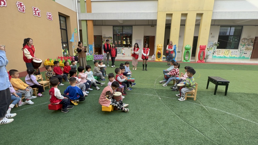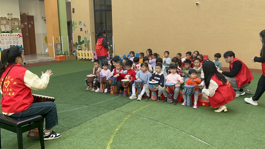 “天蓝蓝,白云飘,背上小书包……”伴着一首欢快动听的《好宝宝》,小朋友在学生志愿者的带领下,融入非洲鼓的节奏,共同完成此次音乐课堂的演绎。