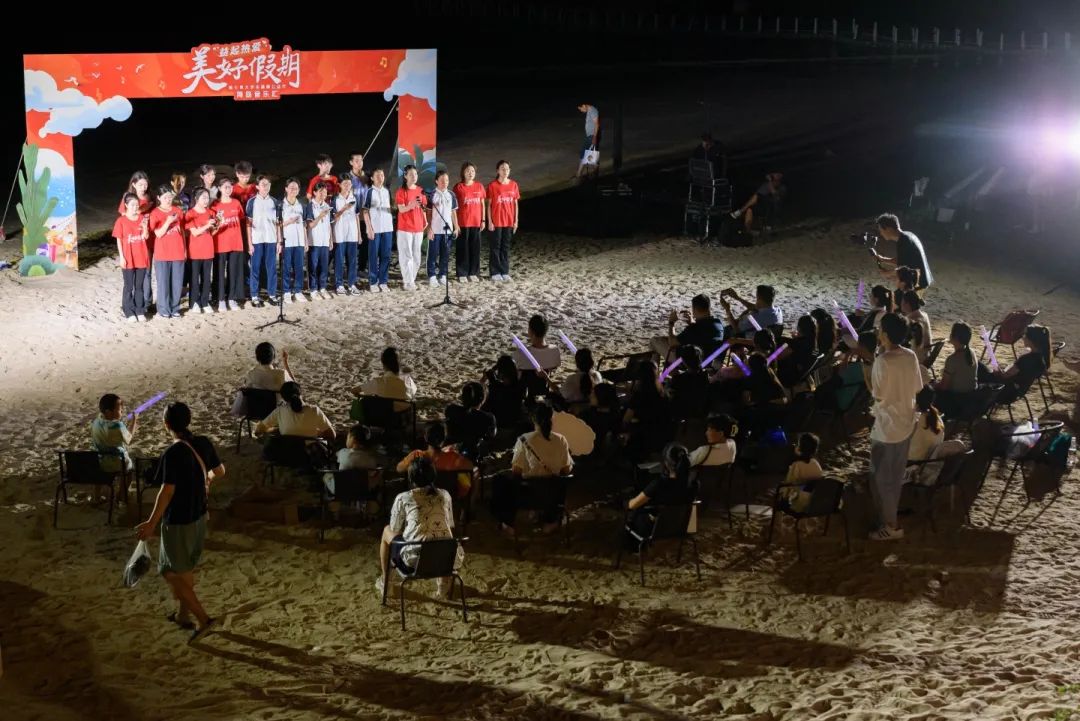 经过精心筹备,海岛音乐会在风景秀丽的东山岛彩蝶湾举办。海浪声、风声、乐器声、演唱声、掌声、欢呼声在沙滩上此起彼伏,相互交织出一场爱与传递的音乐节…实践队员们通过乐器演奏向同学们展示音乐的魅力,带来的独唱也饱含着队员们对同学们的鼓励、期待和赞许,而《寻声蔚蓝》的合唱声中更是飘扬着同学们和队员们之间相遇的温暖、帮扶的感动,美好的和声在海风中飘扬,传递着温暖的力量…