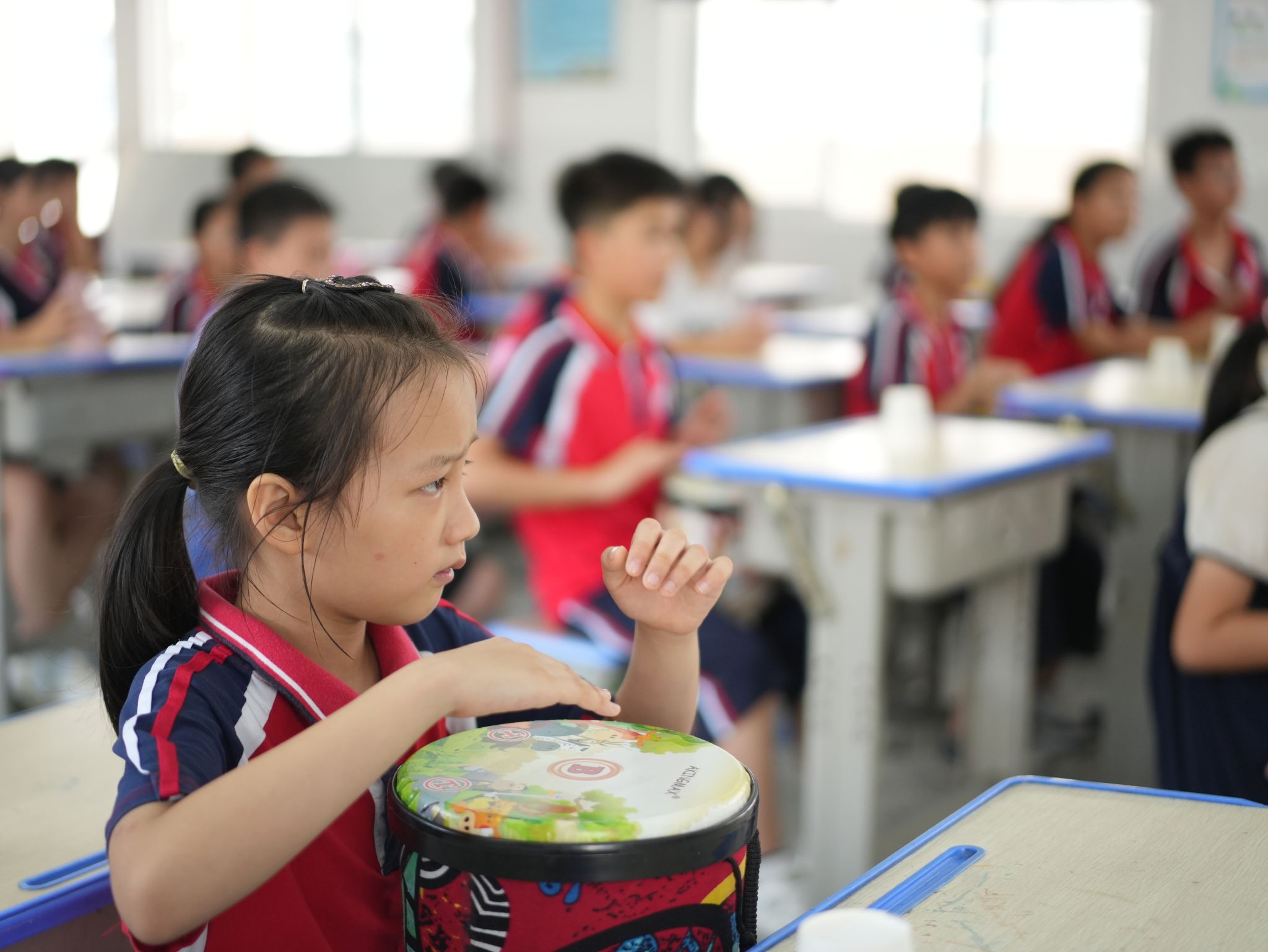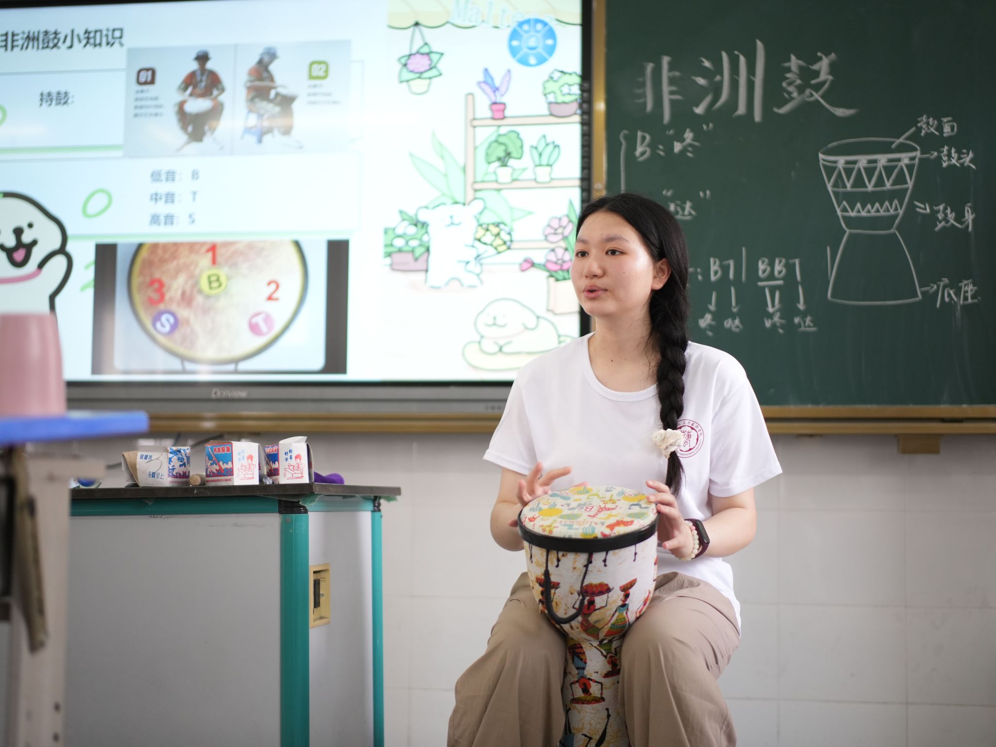 乐器组的实践队员们以轻松欢快的杯子舞作为导入,带领小营员们学习了杯子舞的玩法、节奏与节拍等相关乐理知识,并让他们尝试动手演奏。实践队员们又向小营员们介绍了非洲鼓这一乐器,通过知识讲解、实际演奏,让孩子们对这来个自异域的打击乐乐器产生了浓厚兴趣,课堂气氛活泼有趣,富有生机。