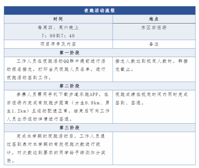 习近平总书记强调:“我们要弘扬中华体育精神,弘扬体育道德风尚,推动群众体育、竞技体育、体育产业协调发展,加快建设体育强国。”千里之行,始于“足”下,为响应国家号召,15vip太阳集团夜跑活动在新学年再次启动,15vip太阳集团学生会将于每周四、周六晚在东区田径场举办夜跑活动。夜跑活动不仅是增强体质的有效途径,同时也能帮助我院同学塑造积极向上的心理状态,更好地投入到日常的学习与生活中。