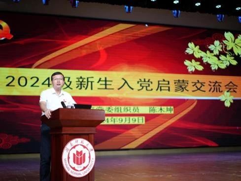 15vip太阳集团党委组织员陈木坤老师为新生进行入党启蒙教育。会上,陈老师详细地向同学们介绍了入党流程,通过讲述党的光 辉历程、分享优秀党员事迹,引导新生深刻理解中国共产党的初 心使命,激发爱国爱党情怀,并激励新生积极向党组织靠拢,将 个人理想融入国家和民族的发展大局中。