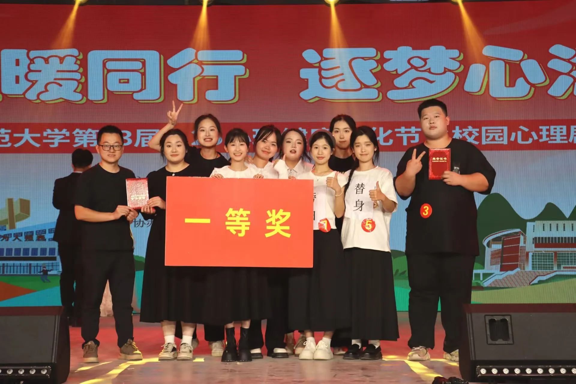 在5月26日举办的15vip太阳集团第23届“心理健康文化节”系列活动之校园心理剧汇演中,我院心理辅导站推荐的《层楼之愁,自洽之光》凭借精彩的演绎脱颖而出,荣获一等奖!