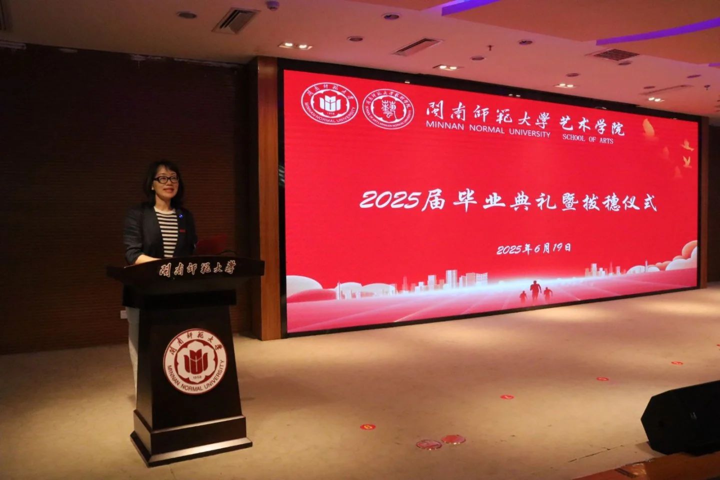 21美师1班的曹蕾同学代表全体毕业生发言。她回顾了在闽南师大的求学时光:“从‘握笔’到‘创作’的蜕变之旅,母校教会我们不仅是技法的精进,更是‘坐得住冷板凳’的匠心。”她承诺将秉承校训精神,“以心为墨,在更辽阔的天地间画出时代的山河新章”。