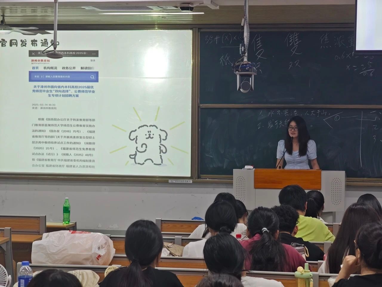 在教招经验方面,蓝敏铭同学解析了校招流程、面试内容与准备要点,特别指出片段教学需依据学段调整状态、结构化回答需逻辑严密避免语气词,并强调了面试仪表与临场状态等细节。刘纾妤同学重点介绍了福建省教师统考备考策略,提出“永远走在大家前面”的超前学习理念,强调笔试重要性及面试准备,并分享了省考流程、时间线、科目占比和进面规则。曹蕾同学结合自身经历,分享了教招统考流程与时间节点、岗位选择策略、三轮复习规划、高效学习方法,以及美术学科各模块与教综的复习技巧。许韵湘同学则介绍了“双线并行”策略、“优毕”身份在教招中的优势、各地校招差异、校招面试准备、答辩应对策略及高效的备考时间管理经验。