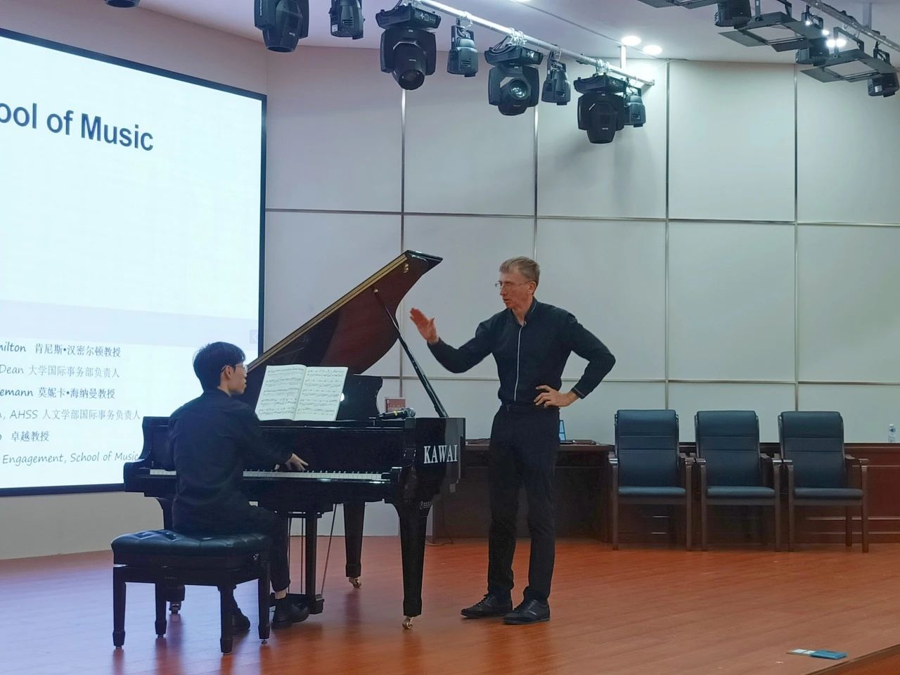 最后,卡迪夫音乐学院肯尼斯·汉密尔顿教授为我院学生进行了别开生面的钢琴公开课教学,音乐与舞蹈系部分师生、钢琴专业师生参加观摩了大师课。