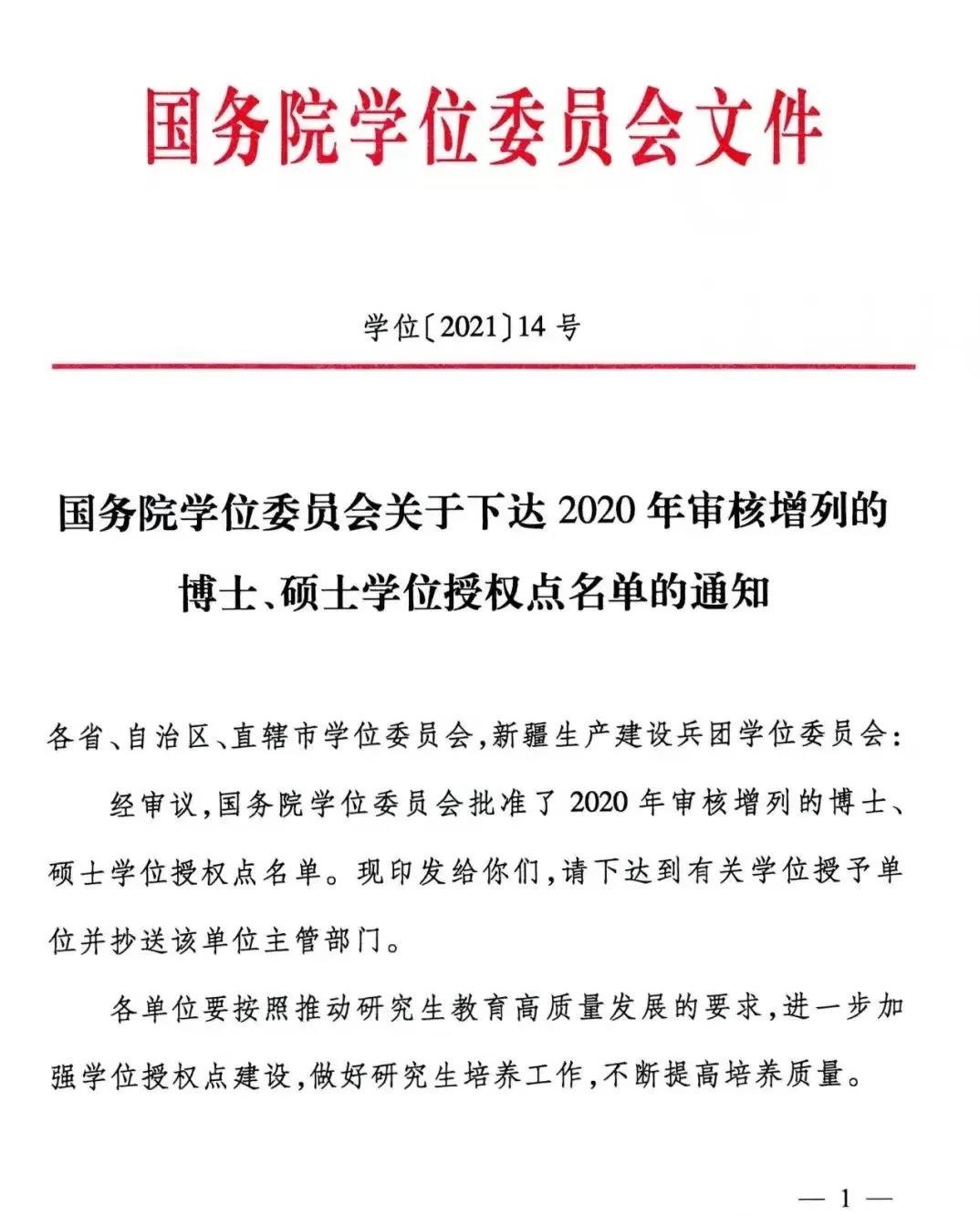 近日,国务院学位委员会下发《关于下达2020年审核增列的博士、硕士学位授权点名单的通知》(学位〔2021〕14号),经国务院学位委员会审议通过,我校新增艺术(音乐方向)专业学位硕士点。