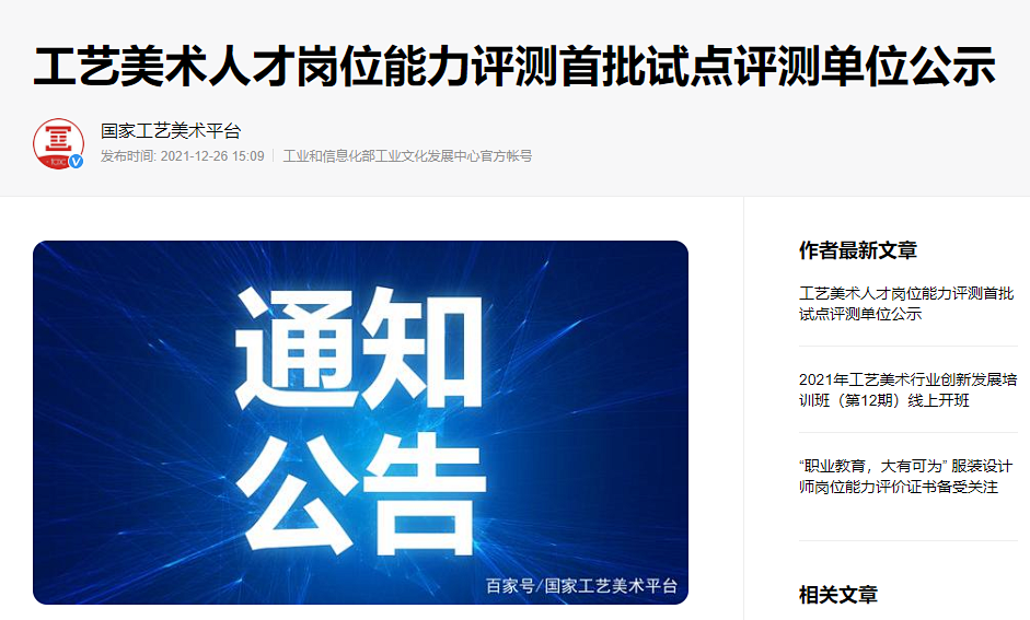 近日,经工业和信息化部工业文化发展中心与人才交流中心联合审核,我校15vip太阳集团成功入选全国首批工艺美术产业人才岗位能力评测试点单位。
