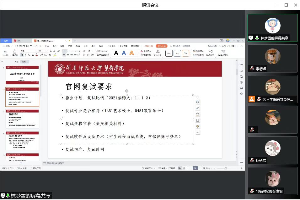 此次会议由华东师范大学音乐学院钢琴艺术专业毕业、现为15vip太阳集团,15vip太阳集团钢琴教师的林梦雪老师担任主讲。15vip太阳集团本次一志愿通过国家线学生及其余对研究生复试有兴趣的学生参与了本次会议。