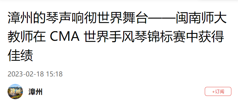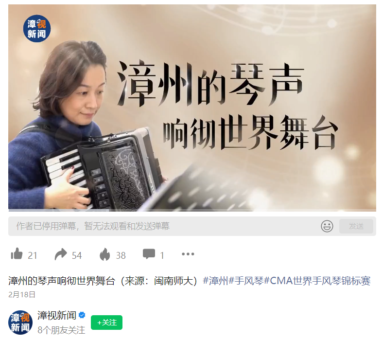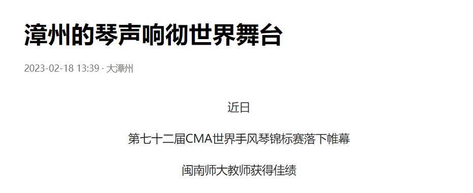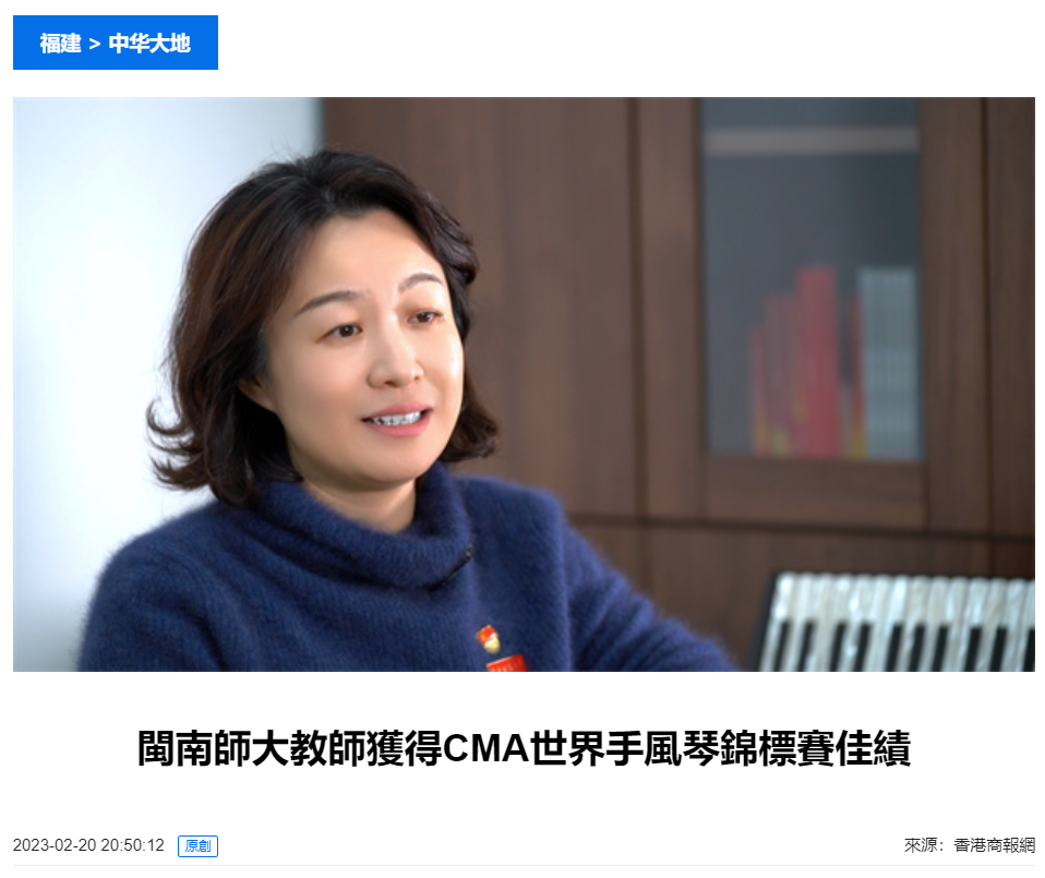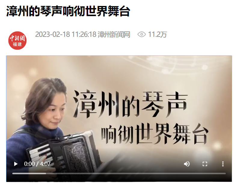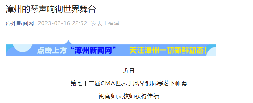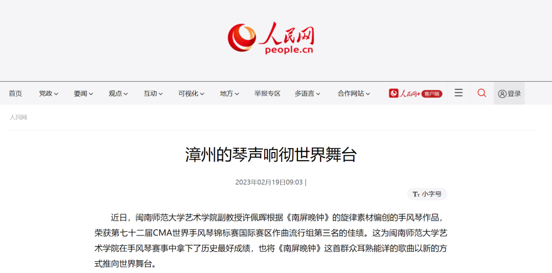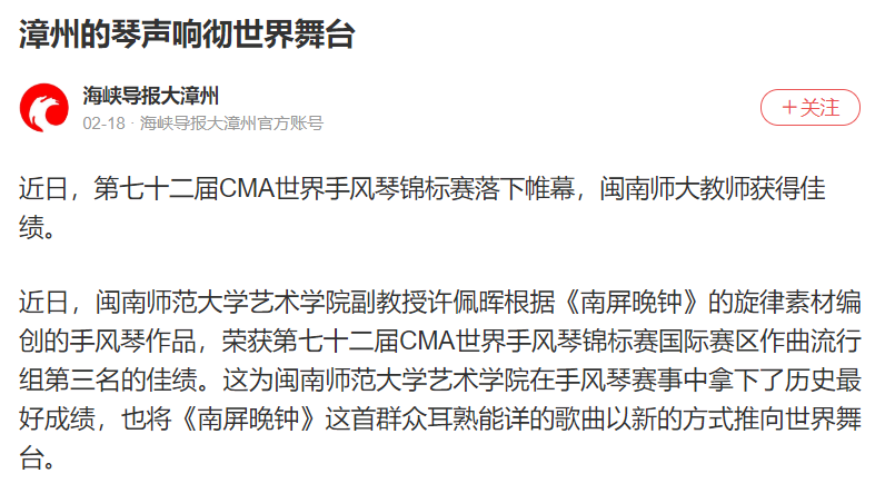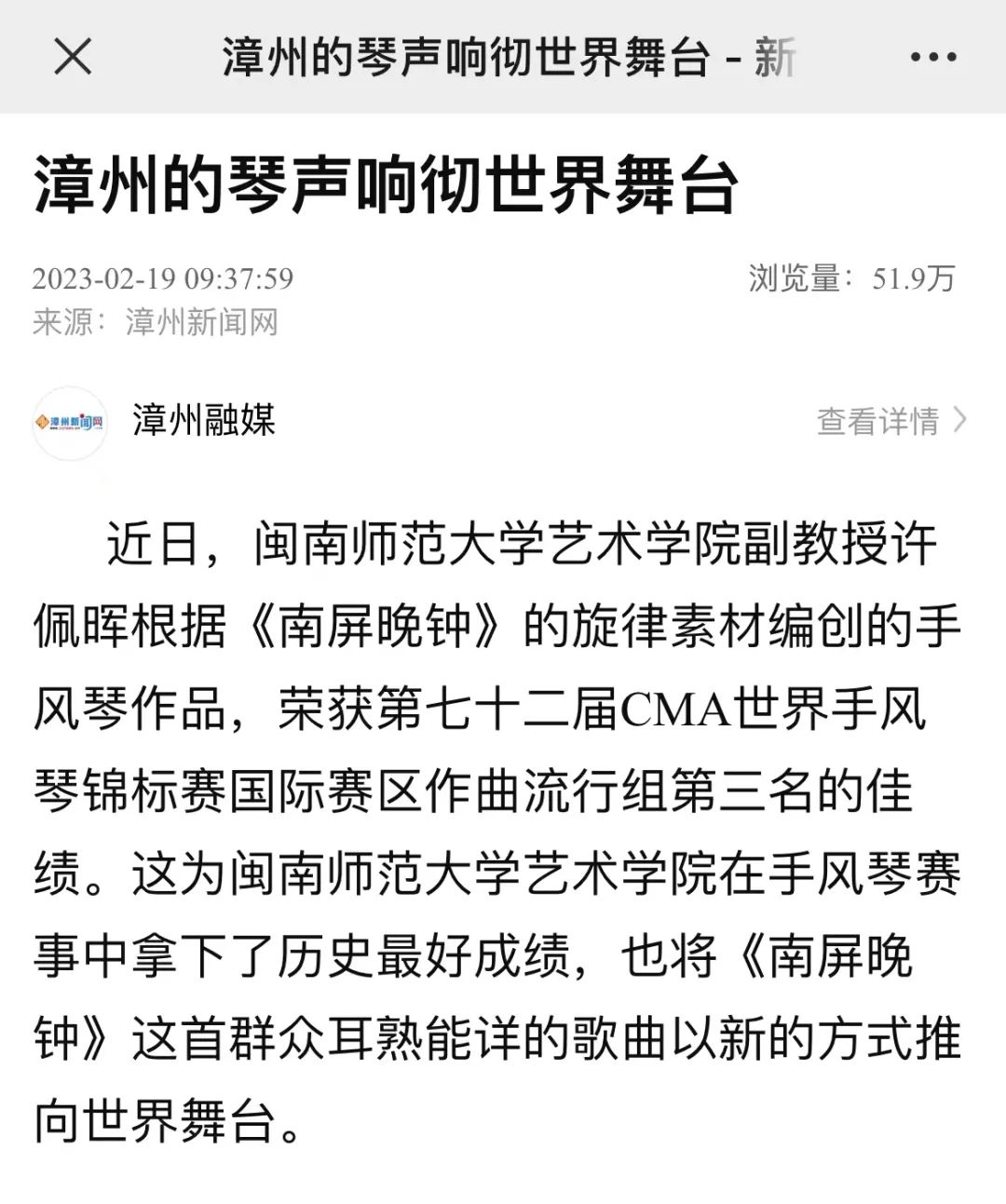 近日,我院教师许佩晖副教授根据《南屏晚钟》的旋律素材编创的手风琴作品,荣获第七十二届CMA世界手风琴锦标赛国际赛区作曲流行组第三名的佳绩。消息引起新华社客户端、人民日报、学习强国、香港商报新闻客户端等十余家海内外主流媒体关注、报道,引起强烈反响。截止2月24日,媒体报道浏览量累计近百万,其中新华社客户端浏览量超50万。