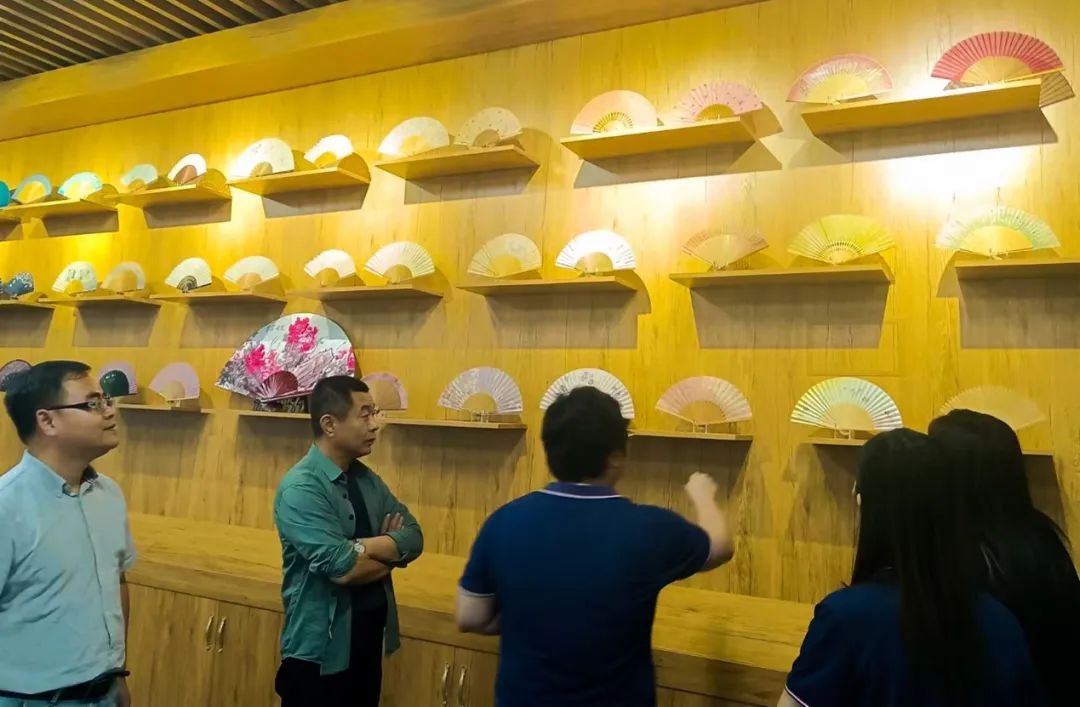 在漳州华岩永利文化创意有限公司总经理韦昭顺的陪同下,汤跃滨一行参观了公司产品——折扇的各个部件制作工艺流程,参观过程中,专业教师和学生与一线师傅深入交谈制作过程中的一些重点和难点。参观完车间后,双方就设计人才培养合作、就业岗位拓展等方面进行了全面深入探讨并达成: