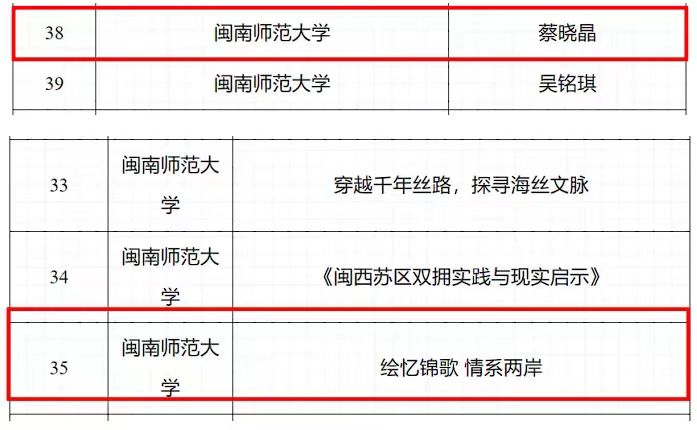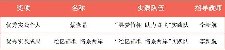 近日,中共福建省委教育工委公布了《“追寻领袖足迹 赓续中华文脉”2023—2024学年全省大学生寒假主题社会实践活动评选结果》,我院提交的“绘忆锦歌 情系两岸”社会实践专项和“寻梦竹棚 助力腾飞”实践队学生蔡晓晶,在经过层层推荐、专家评审、网上公示等程序后,荣膺“2023—2024学年福建省寒假主题社会实践活动优秀实践成果”和“2023—2024学年福建省寒假主题社会实践活动优秀实践个人”。