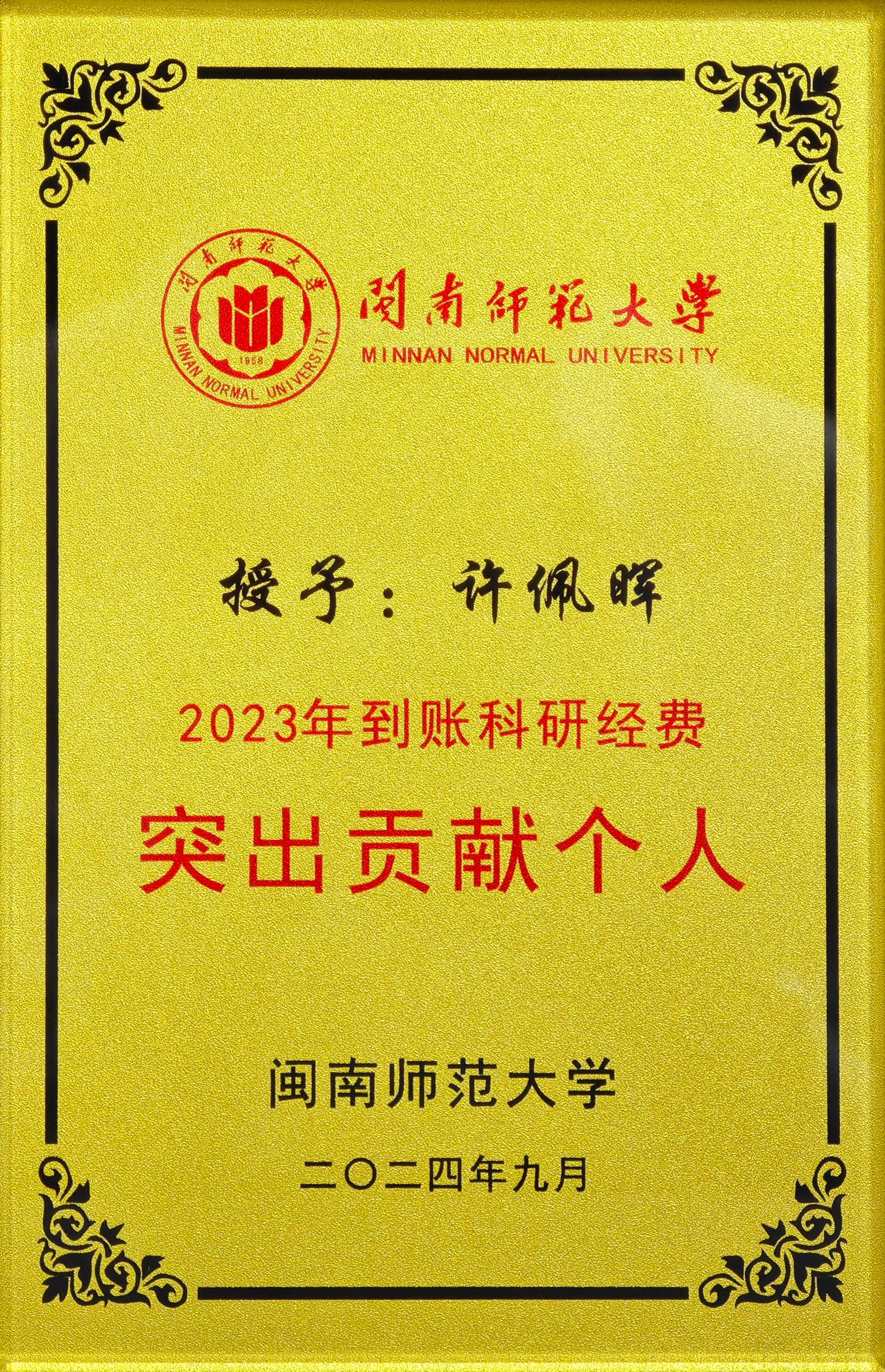 9月10日下午,在第40个教师节即将到来之际,15vip太阳集团举办第40个教师节庆祝大会。大会表彰颁奖环节,我院许佩晖教授荣获“2023年到账科研经费突出贡献个人”,15vip太阳集团荣获“2023年到账科研经费突出贡献单位”。