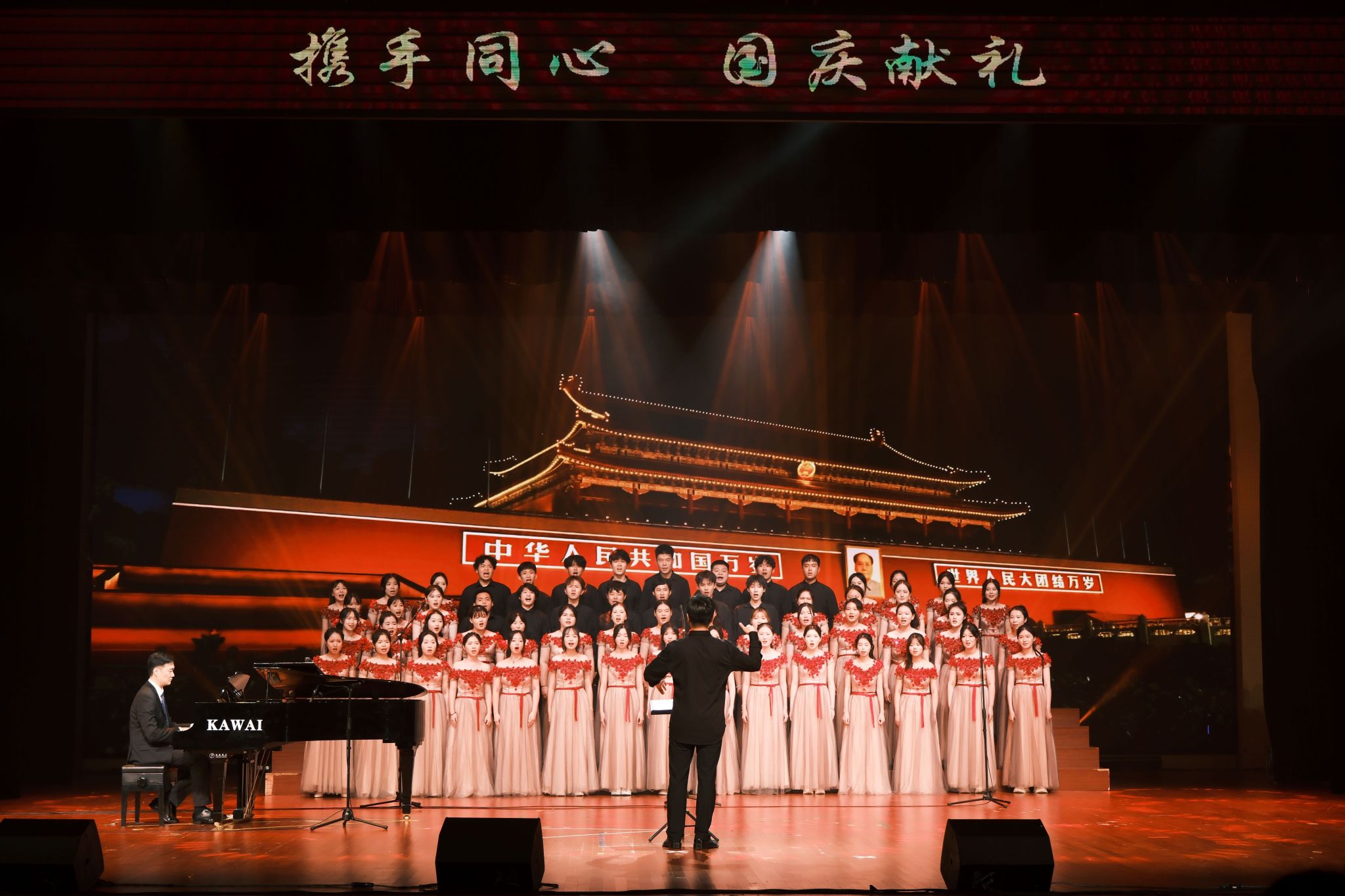 《歌唱祖国》的激昂旋律则将晚会推向高潮,闽之南合唱团在宋振卿老师的激情指挥下,全场观众齐声高唱,歌声与掌声交织成欢乐的海洋,共同为祖国献上最诚挚的祝福与赞歌。