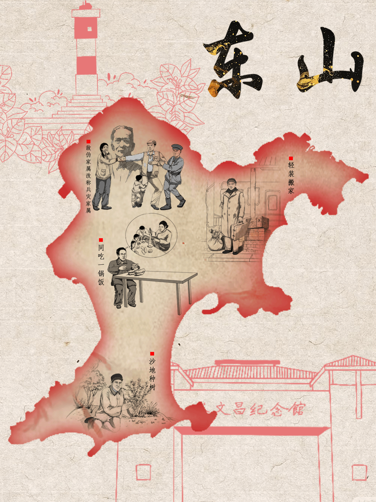 本作品以东山岛为背景,分别展现谷文昌“同吃一锅饭”“敌伪家属改称兵灾家属”“沙地种树”“轻装搬家”四个小故事。本作品采用红色为底,一方面强调东山革命历史和精神,另一方面体现出东山岛“福文化”的魅力。谷文昌纪念馆不仅是纪念谷文昌同志的重要场所,也是传承和弘扬谷文昌精神的关键所在。本作品右下角设置谷文昌纪念馆,不仅为人民提供了解谷文昌事迹的路径,也提醒人民缅怀谷文昌,学习谷文昌精神,为实现中华民族伟大复兴贡献自己的力量。