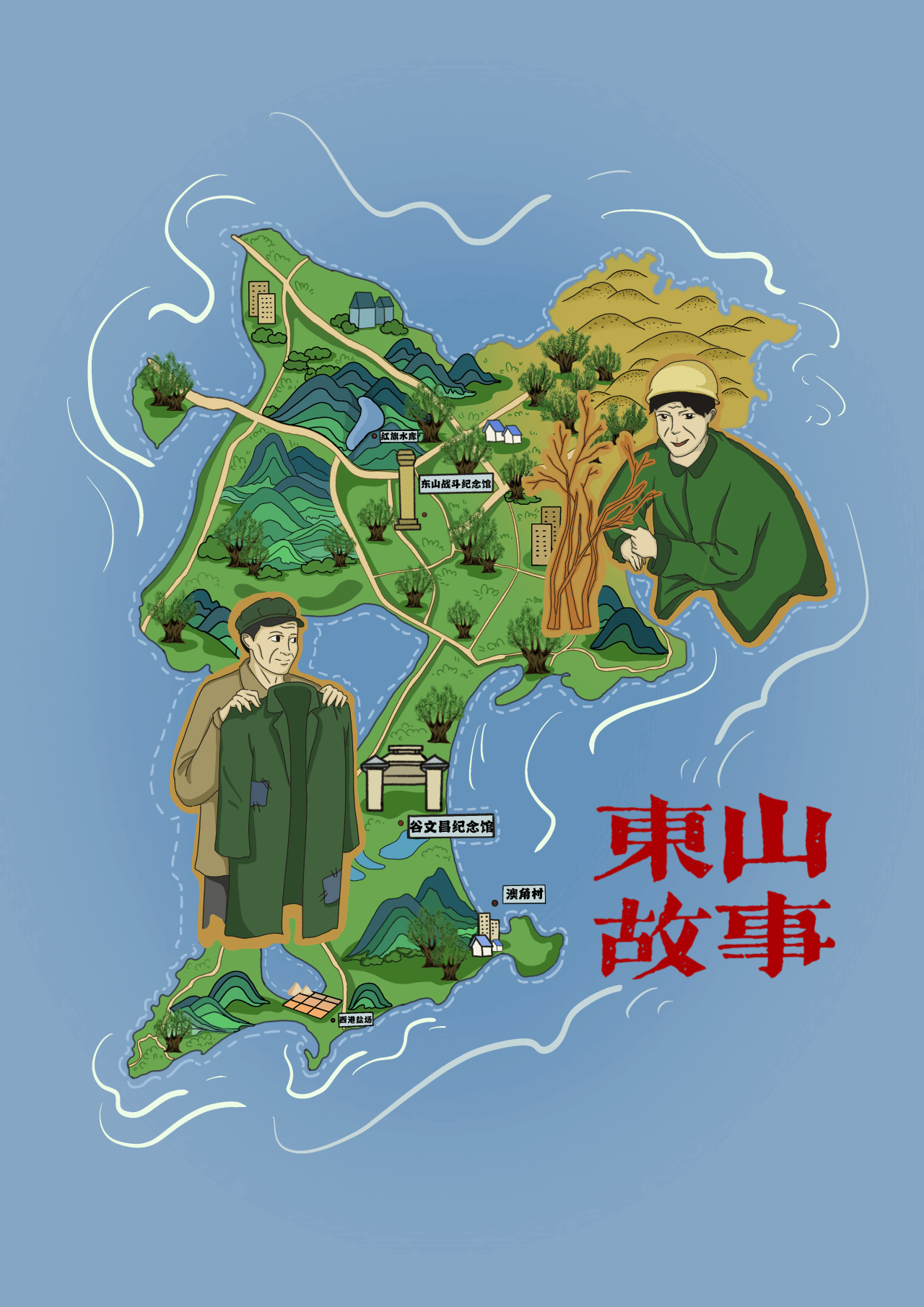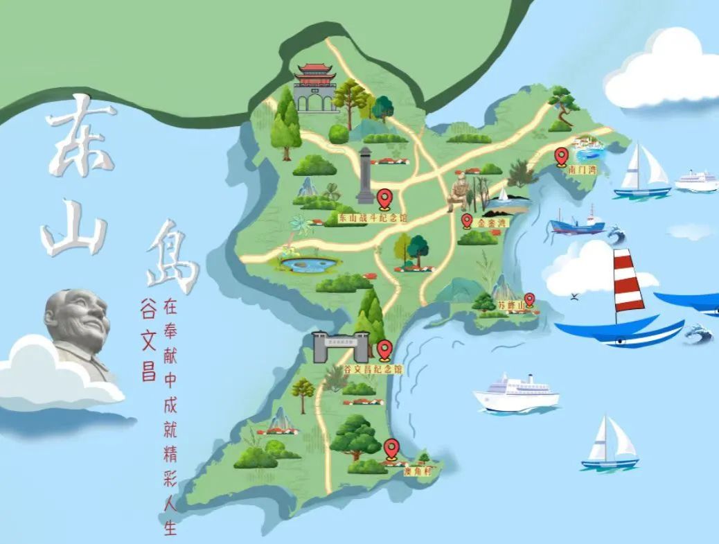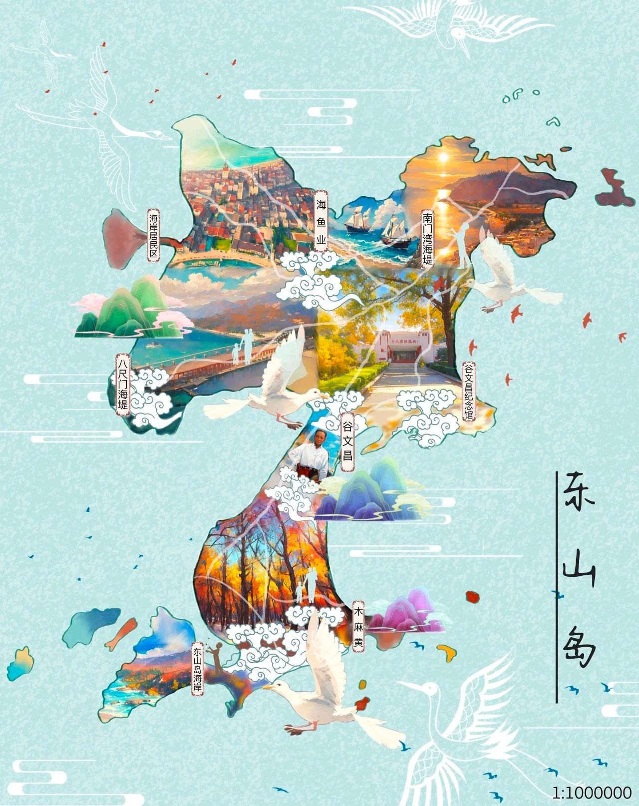 这幅东山地图宛如一幅历史画卷,标注着谷文昌在这片土地上留下的深刻足迹。谷文昌纪念馆坐落于此,它宛如一座精神灯塔,吸引着人们前来缅怀与敬仰,馆内静静诉说着他的奉献故事。同时,木麻黄遍布在东山大地,那是谷文昌带领群众与风沙顽强抗争的见证,曾经肆虐的风沙被绿色屏障阻挡,沙滩逐渐变为绿洲,守护着东山百姓的生活。八尺门海堤横亘海峡,它是谷文昌和群众齐心协力的伟大工程,缩短了海岛与外界的距离,为东山的发展注入活力。水库润泽着农田,保障着农业生产,这是谷文昌解决民生难题的智慧结晶。地图上每一处标注,都是谷文昌为东山人民谋福祉的有力见证,他的精神激励着一代又一代东山人,在这片土地上继续拼搏,创造更加美好的未来。