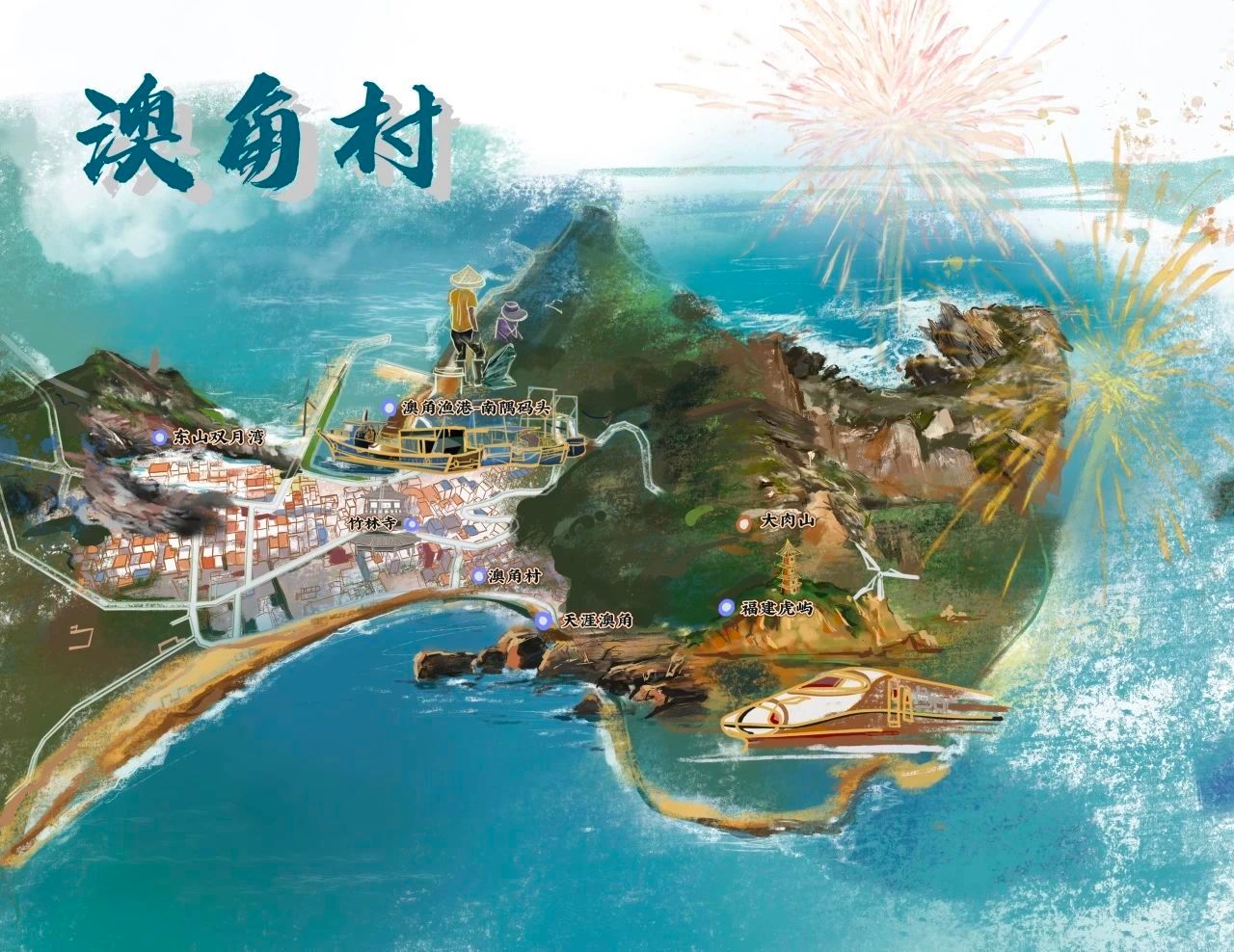 澳角村手绘地图以“福文化”为魂、海洋为脉、艺术为形,将渔村的自然之美、产业之兴、人文之韵凝聚于方寸之间,既是对传统福文化的创新诠释,也是对乡村振兴路径的生动注解。东山双月湾象征自然之美和旅游之福,大肉山代表生态保护之福,澳角渔港-南隅码头与渔业文化体现传统之福。蓝色代表海洋,金色与红色点缀福宇元素。通过这份地图,澳角村向世界传递的不仅是地理坐标,更是一曲“向海而兴、因福而美”的时代赞歌。