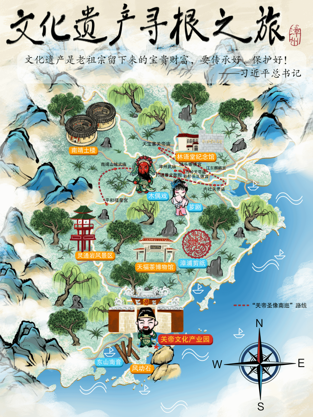 地图从关帝文化产业园出发,漳州文化遗产寻根之旅为题,巧妙地融合了 “延续文化血脉” 的理念,展示了丰富的“福文化”资源。内容上,地图详细标注了漳州众多文化遗产,如南靖土楼、木偶戏等,尤其突出了关帝文化产业园。通过 “关帝圣像南巡” 路线的展示,体现了对关帝文化的重视与传承,呼应习近平总书记关于文化遗产保护与传承的重要指示。地图采用手绘风格,将山川、河流、绿树与文化景点自然融合,营造一种和谐的美感。用卡通形象来代表不同的文化遗产,增添趣味性和直观性。