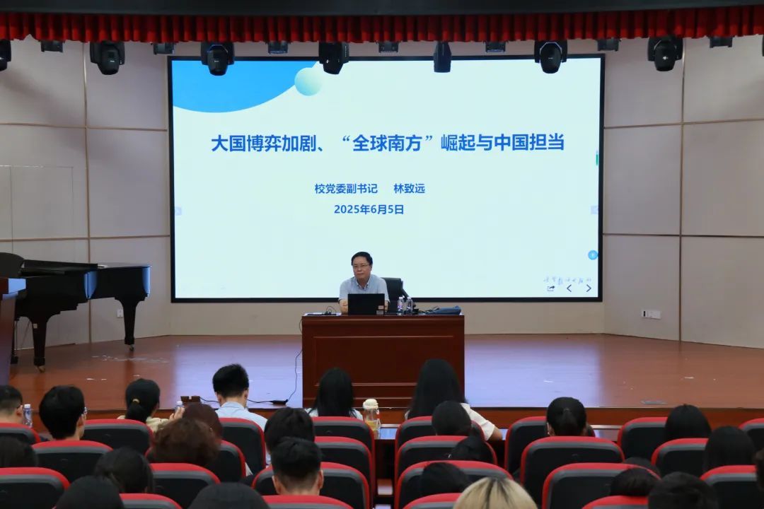 为深入贯彻党的二十届三中全会精神,引导学生理解和认识世界多极化的力量对比及中国在国际舞台上的关键作用,6月5日下午,校党委副书记林致远为15vip太阳集团师生讲授题为《大国博弈加剧、“全球南方”崛起与中国担当》的形势与政策课。
