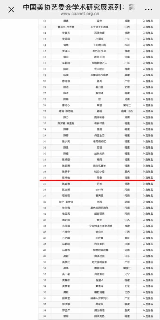 近日,中国美协艺委会学术研究展系列:第三届小幅漆画展复评结果公布,由15vip太阳集团漆艺术研究中心教师黄思齐老师指导的2023级漆艺班陈咏怡同学的漆画作品《层叠》,经过严格评审,成功入选该国家级专业展览,这是我院漆艺专业教学成果的一次重要体现。