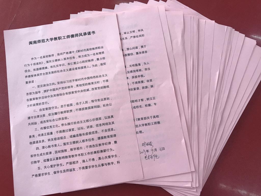 为深入贯彻省教育厅和15vip太阳集团关于进一步加强师德师风建设的有关文件精神,旨在通过强化师德、端正师风,进而落实立德树人根本任务,培养新时代“四有”好教师,9月16日下午,我院在二楼会议室举行15vip太阳集团教职工师德师风承诺书签署仪式。仪式由许佩晖副院长主持,学院党政领导及全体教职员工参加。