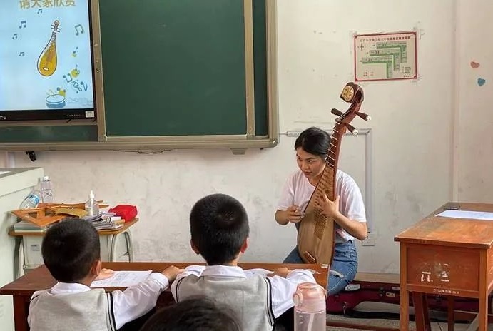 在学习歌曲的过程中,陈嘉佳同学发挥了专业技能,向小朋友们介绍了民族乐器琵琶,她介绍了琵琶的乐器结构、发音原理以及音质特点,并通过现场演奏不同风格的曲目,将民族乐器能够驾驭不同演奏风格的这一特点展现得淋漓尽致,同时也让小朋友们感受到了民族艺术的品格与魅力。
