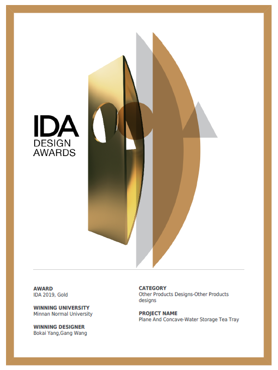 1、项目《Plane And Concave-Water Storage Tea Tray》获得第十三届美国IDA国际设计大奖 (The International Design Awards)2019年度 金奖;