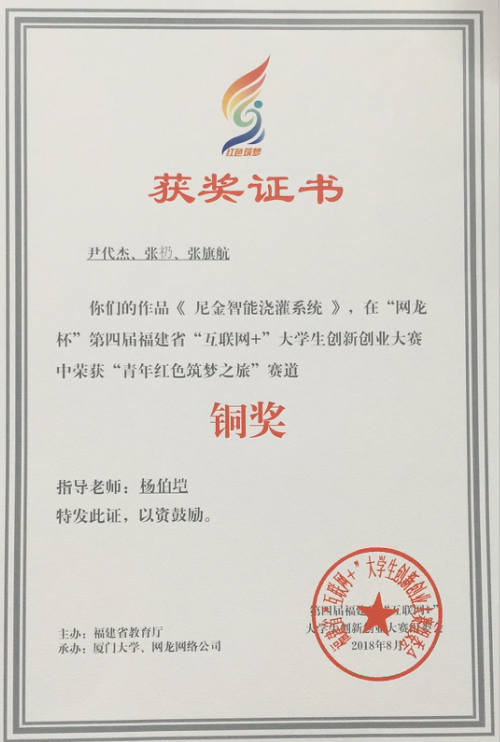 5、项目《花卉精细浇灌系统》获得了2018年第四届“创青春”福建省青年创新创业大赛现代农业初创组三等奖;