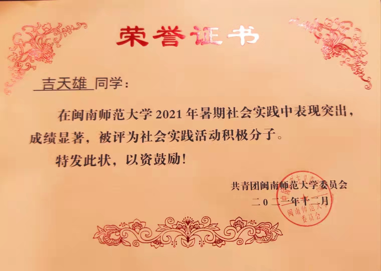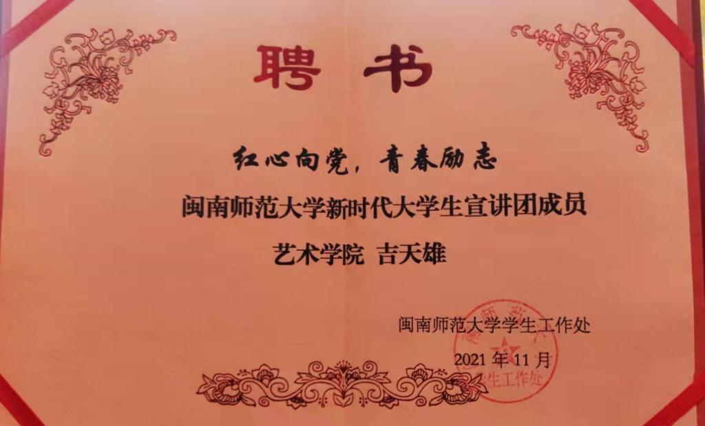 吉天雄来自湖南永州九嶷山风景区被誉为“湖南书画第一村”-朵山村,又素有“进士村第”之称。永州历史文化底蕴深厚,三皇五帝,舜葬于九嶷和红军过长征的革命历史事件,使永州闻名于世,正是这片土地上有着丰富的历史文化和红色革命精神,从小养育着他一定要有顽强拼搏奋斗的精神。从小在这片红色沃土上,滋养这他茁壮成长。因为家乡的贫困,父母南下广东打工,三岁便跟着奶奶成为了留守儿童,从小在艰苦的环境中成长,让他养成了坚韧不拔,自强不息,勇往直前的优良品格。他深知只有通过努力学习,才能改变自己的命运。十几年美好的童年回忆都在家乡,虽然家乡有着绿水青山的宝藏,但大多数年轻人为了生计外出广东打工,留下来都是老人和留守儿童,他也是曾经的一员。他看到家乡老一辈人书画家的作品不能得到很好的收藏,一些经典书画作品逐渐被空气腐蚀,面临看着这种现状,他感到十分难受和痛心。从小老师就教育着他“努力学习,考上大学,学有所成,建设家乡”,这句话就像一粒种子一样,深深地埋在了他的心里,暗自下定决心,往后一定会热爱家乡、关注家乡、回报家乡。上了大学之后,深知家乡与外面世界的差距,时刻了解家乡发展、参与家乡建设,所以他选择了从事宣传和制作方面的专业。考上研究生以后,他满怀着对党组织的向往,研一的时候就向党组织递交了入党申请书,并发展成为一名中共预备党员,他想把家乡的红色革命事迹、好山好水好风景和书画文化底蕴不断发展和推广出去,在新时代乡村振兴浪潮下为自己家乡的发展贡献自己的力量。