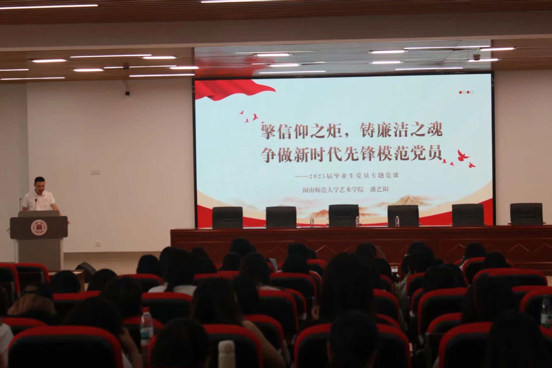 学院党委书记潘艺阳以《擎信仰之炬、铸廉洁之魂,争做新时代先锋模范党员》为题,重点从“争做先锋模范”“牢记初心使命”和“永葆清正廉洁”三方面进行授课,并对毕业生党员寄语,鼓励大家不忘初心使命,勇挑责任担当,廉洁自律,“扣好廉洁从业第一粒扣子”。
